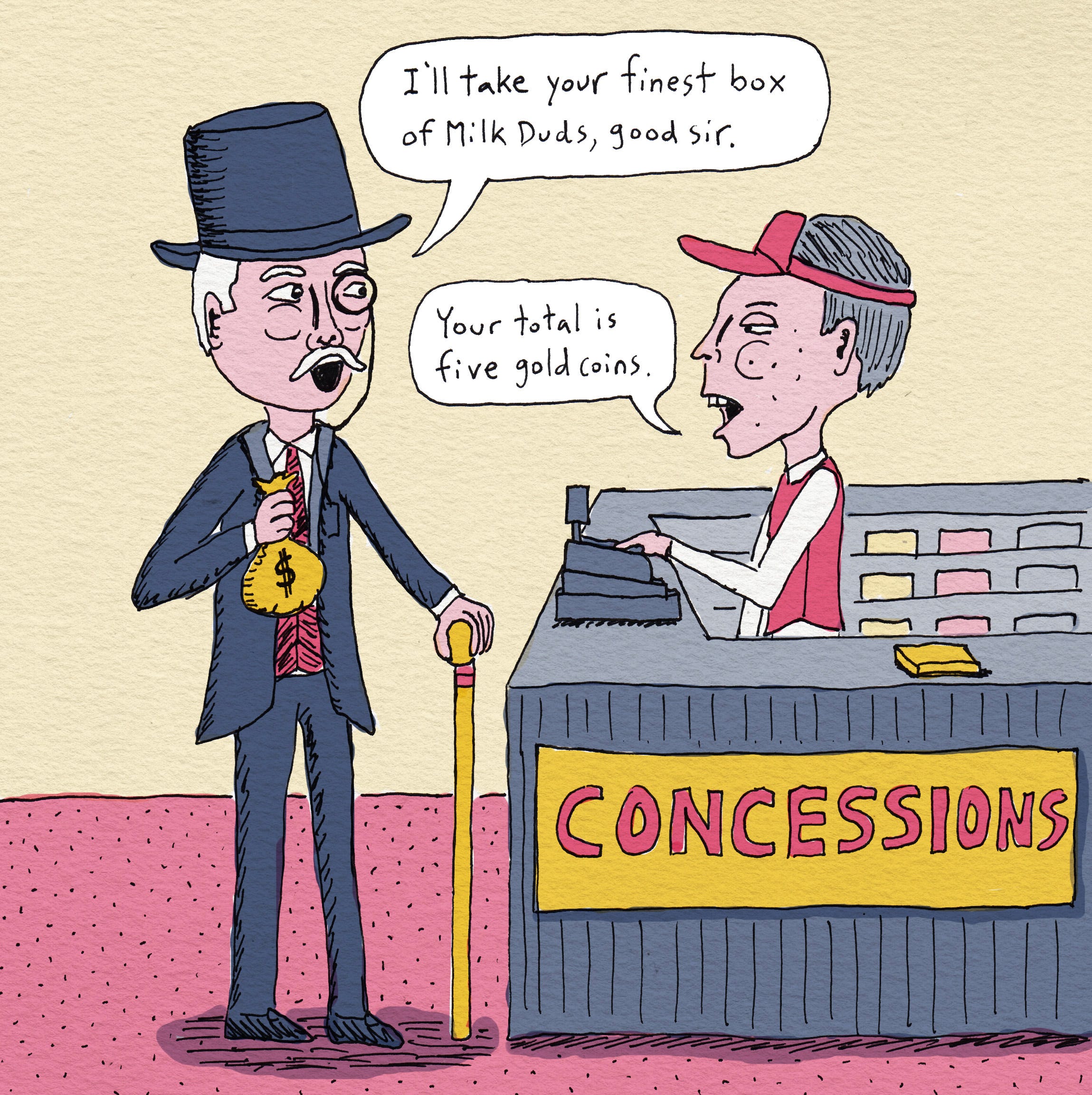 The ticket collector was our last line of defense to get by. I tried to act casual while attempting to ignore how cold the drinks stuffed against my crotch were. I took a quick glance back and Sylvia still had her candy well hidden.