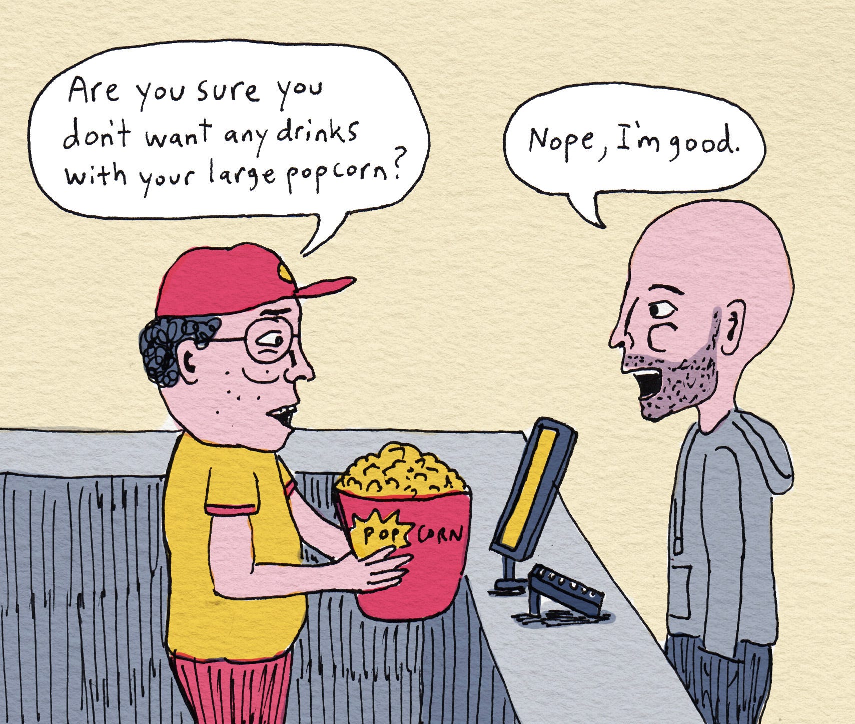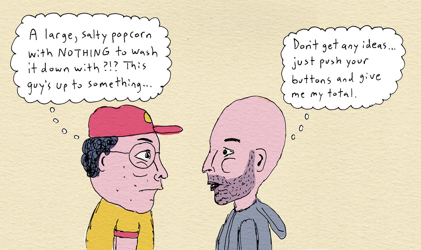 Best thing I’ve read all day! That big sleeve of popcorn had me rolling 🤣🤣🤣
