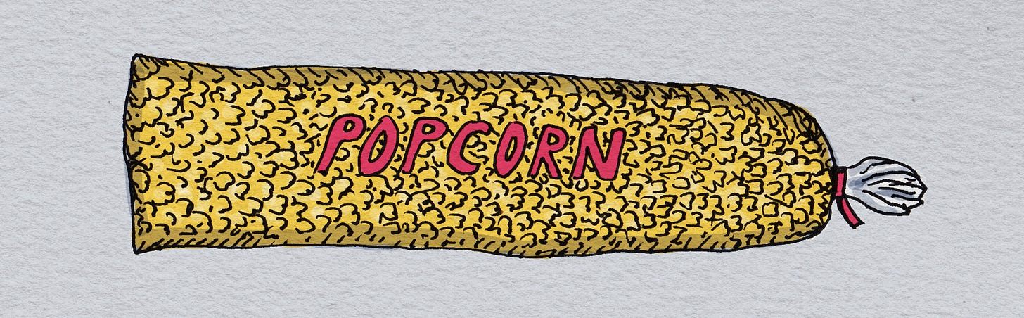 The theater was connected to an indoor shopping center, so it was easy to buy your movie snacks at the attached grocery store and then sneak them in. I guess I was looking for a challenge on that particular day, because I bought one of those long bags of popcorn at the grocery store.