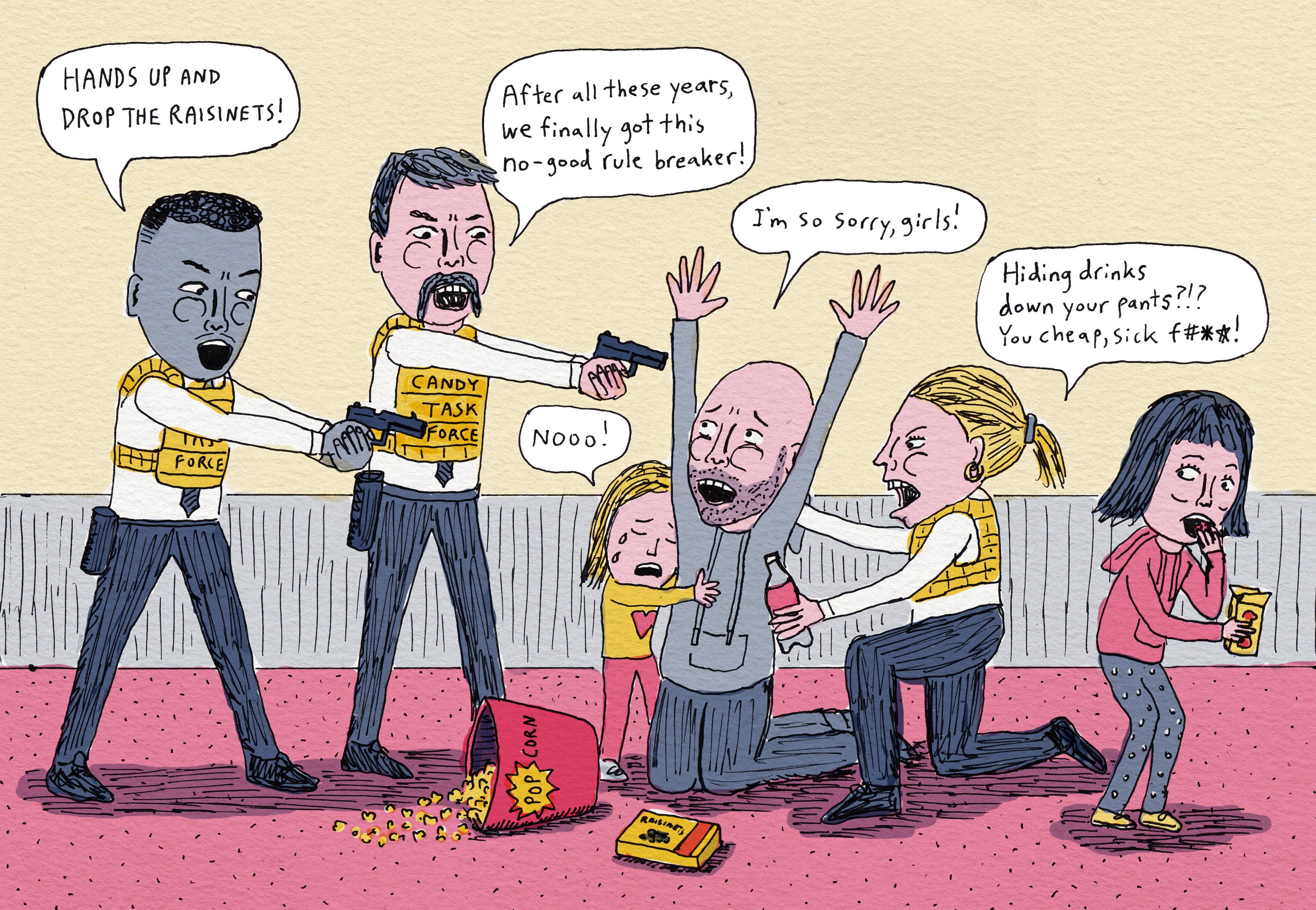 I quickly tried to explain that you are supposed to buy them at the theater, but they are really expensive, so this is what we do. As I was shoving another drink down my pants, she asked me something that stopped me in my tracks…