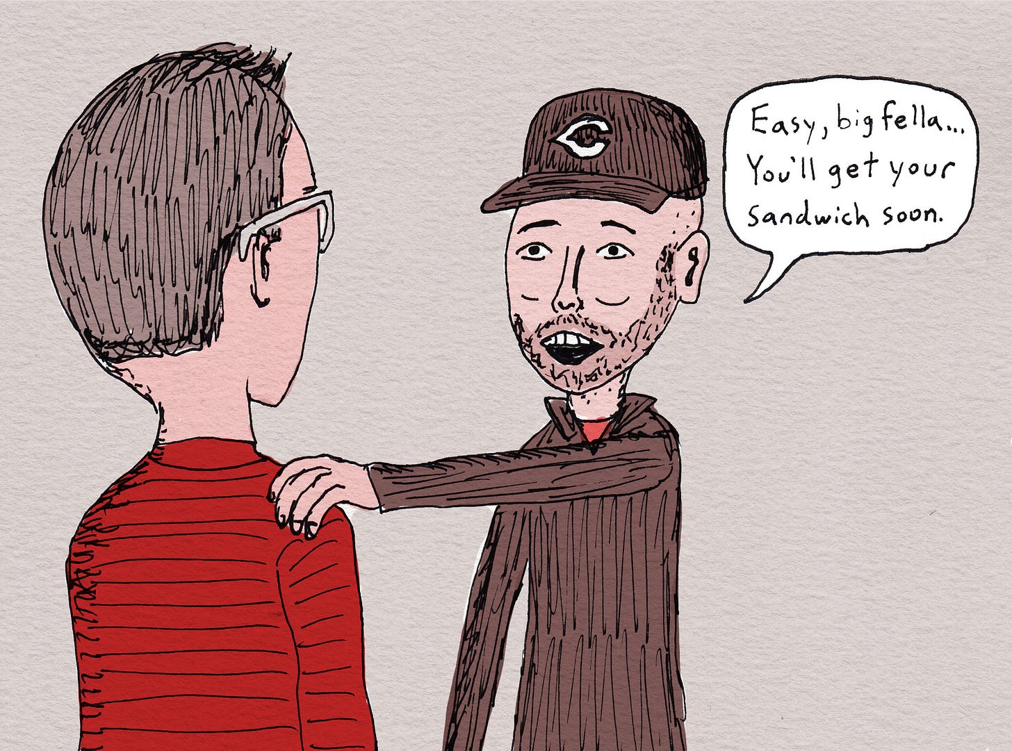 Rob was hangry and stressing about his food. I tried to calm him down.